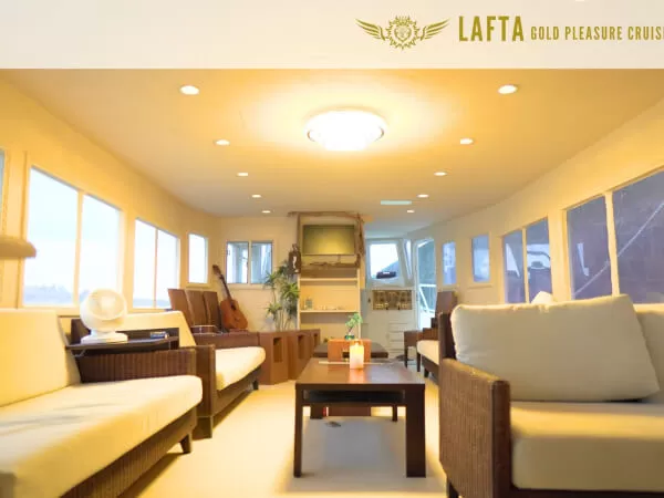 船内は、ラウンジソファーやシャンデリアがあり、まるで海上ヴィラのような、くつろげる空間です。