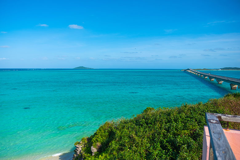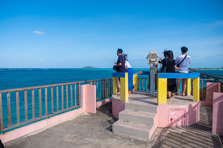 展望台からの眺めは、池間ブルーの絶景に加え、池間大橋と大神島(おおがみじま)まで一望できます!