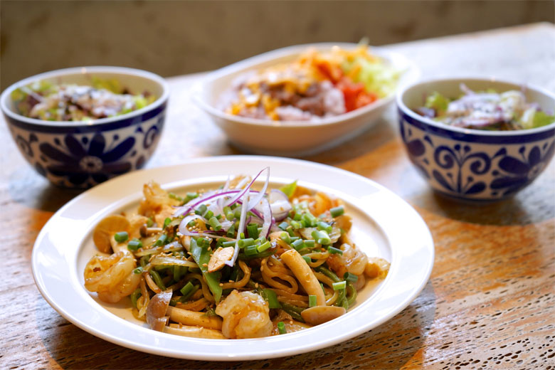 2色の麺で作られる「八重山そばミーゴレン(インドネシア風焼きそば)」には、八重山そばをアレンジした特注の生麺を使用しています。