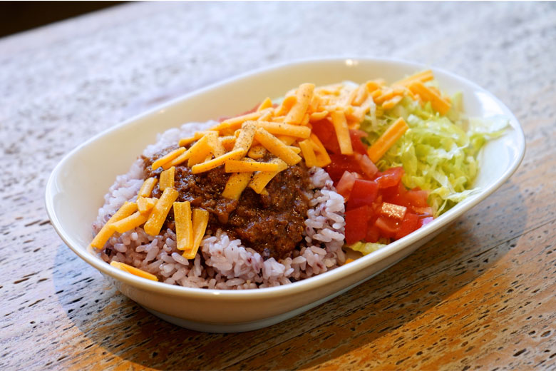沖縄の定番料理、「タコライス」もBanana Cafeで人気の一皿です。よく混ぜてお召し上がりください。