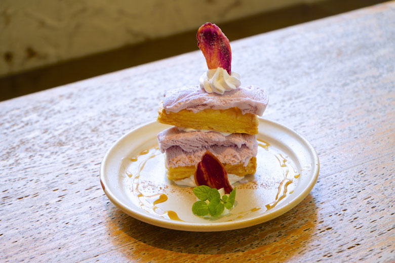 紅芋アイスのクリーミーで冷たい食感とサクサクのパイ生地が絶妙なバランスの「紅芋アイスのミルフィーユ仕立て」。