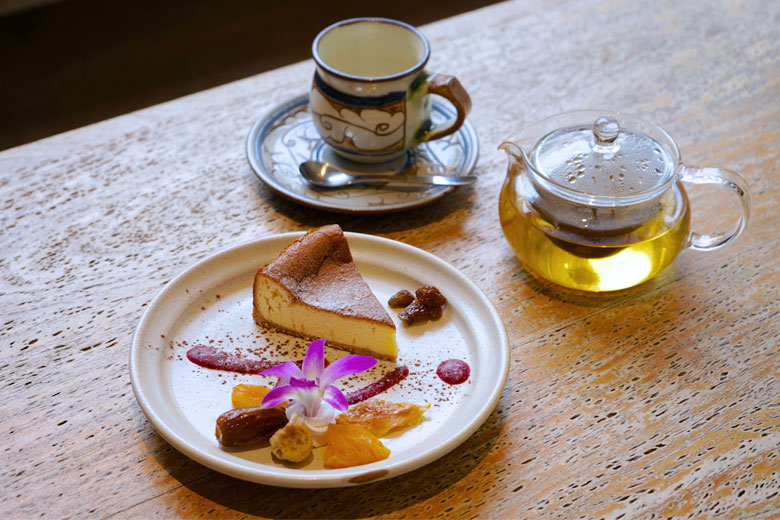 「Banana Cafe特製 ベイクドチーズケーキ」は、口の中でホロッと溶けるやさしい味わいのケーキです。