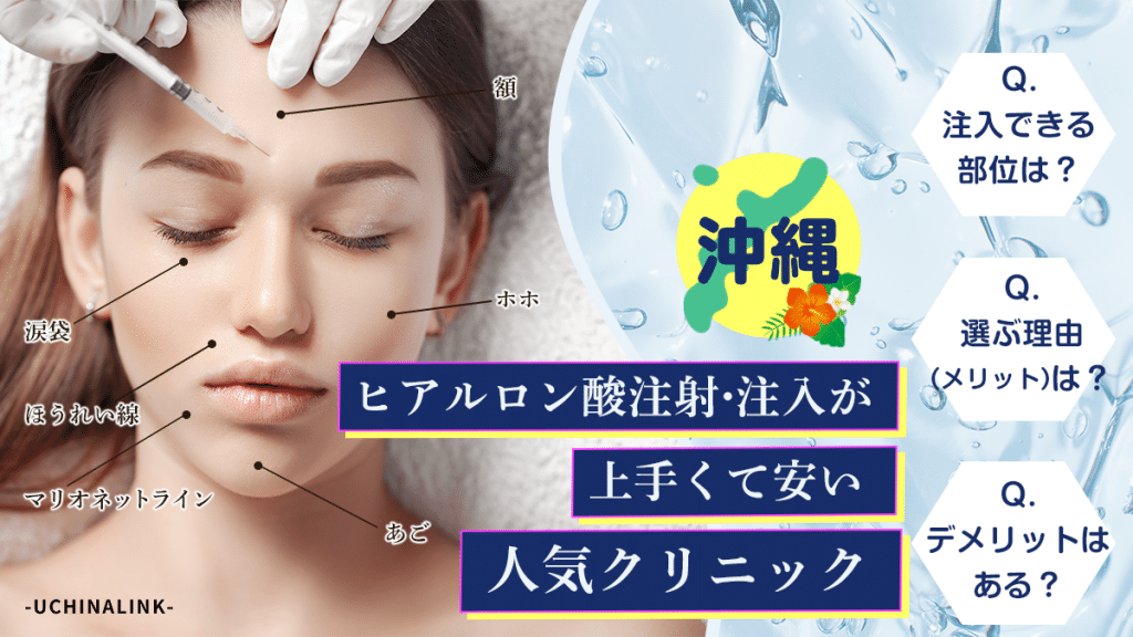顔のパーツに関するさまざまな悩みに効果があるヒアルロン酸注射に関心を持っている方も多いでしょう。 この記事では、沖縄でヒアルロン酸注射を受けられるおすすめのクリニックを紹介します。 この記事でわかること 沖縄でヒアルロン酸注射が上手いクリニ... -