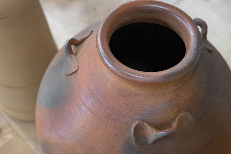 甕の持っている金属イオンが熟成を促進する効果があることから、釉薬を一切使わない“素焼き”にこだわりましたが、釉薬をコーティングしない甕は密度が低く、アルコールを入れても漏れない甕を造るのは容易なことではありませんでした。