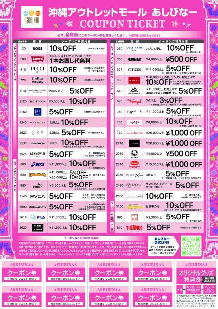 沖縄アウトレットモールあしびなー1Fのインフォメーションセンターにて、当ページをお見せください。