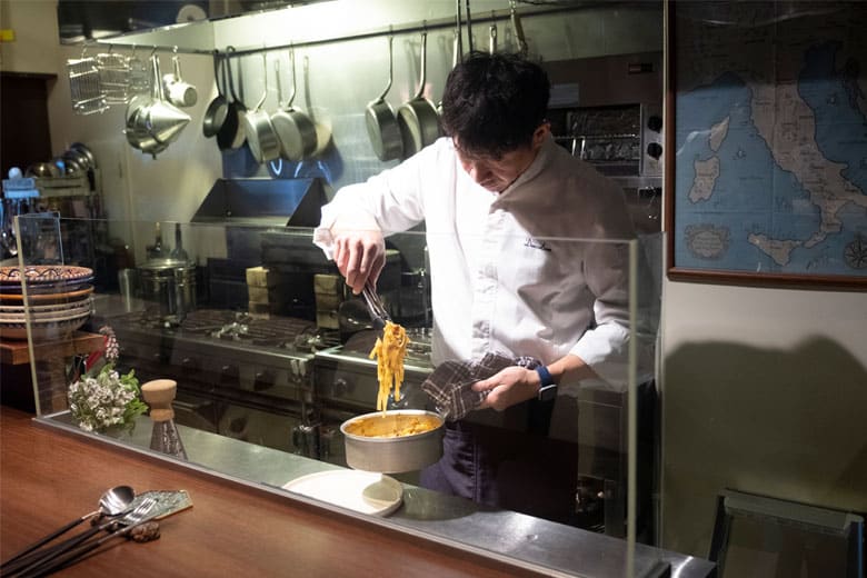 現在のお店の元となったドンコリーノは30席ほどあって、店内が広すぎることでお越しいただいたお客様とシェフが直接話す機会が少なかったことから、あえて客席を減らすことで、お店や料理をもっと削ぎ落とし、研ぎ澄まされたレストランのドンコリismとして生まれ変わりました。