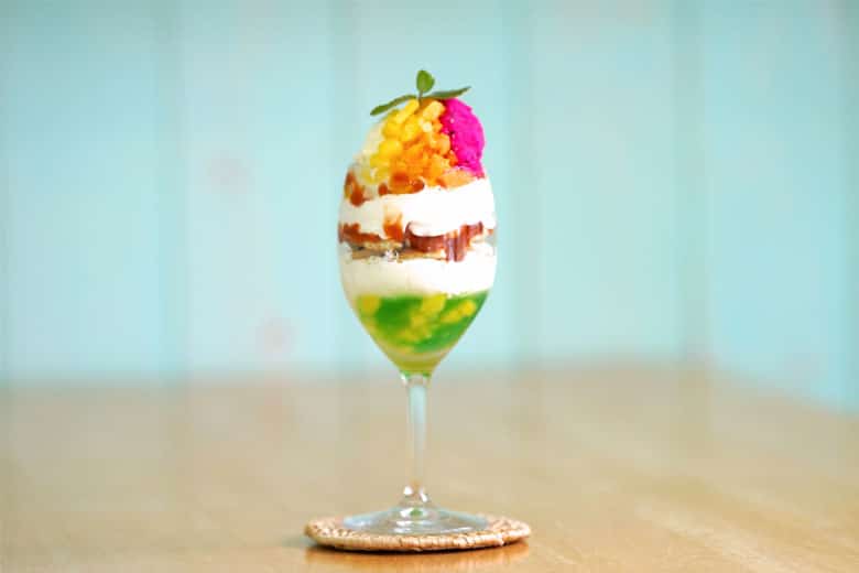 「南国ココナッツパフェ」には、ドラゴンフルーツのシャーベット、カットマンゴーやパインなどのフルーツとココナッツのアイスクリームが使用されています。