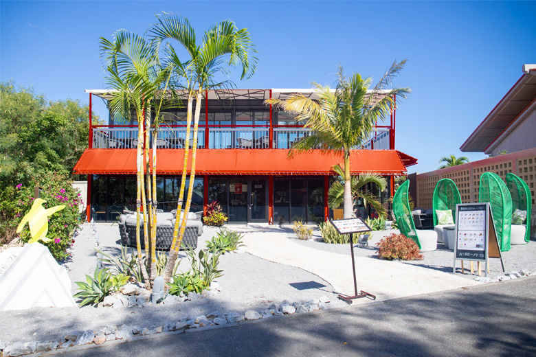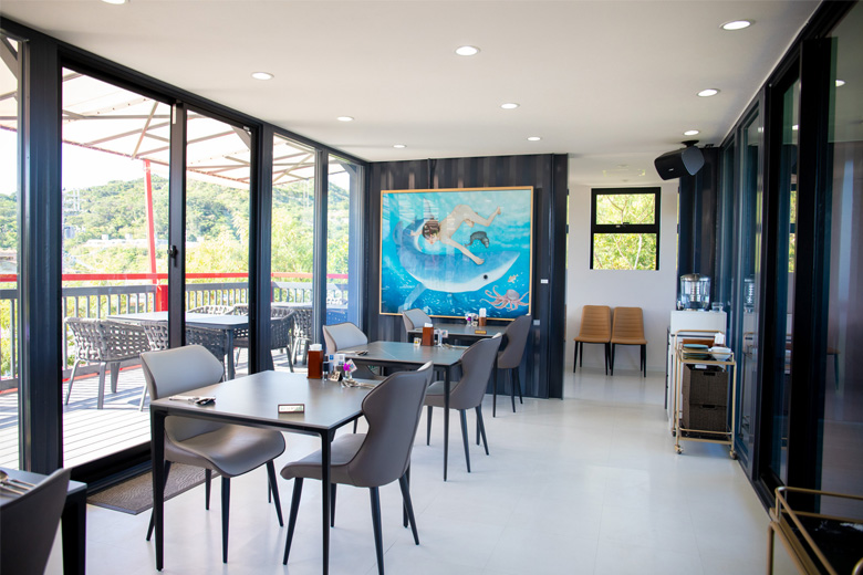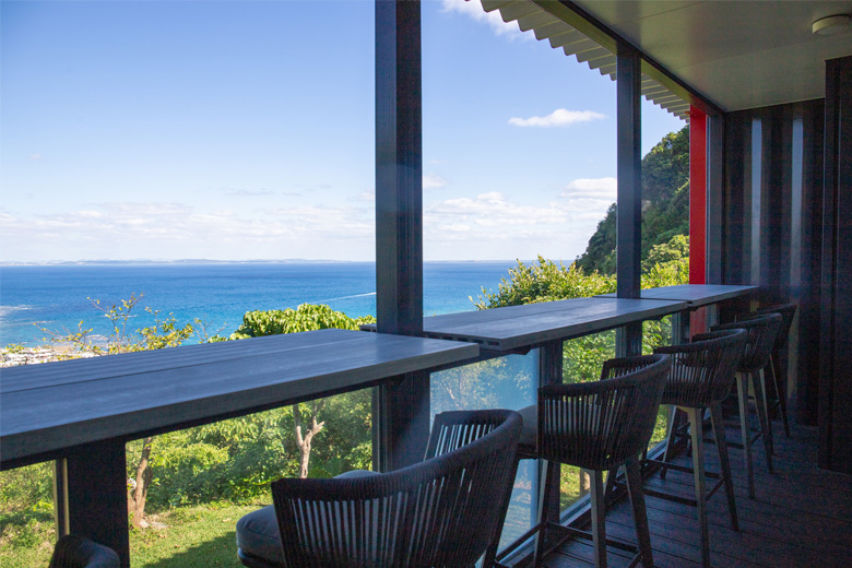 お店は1階2階それぞれにテラス席があり、中でも2階のテラス席は、視界いっぱいに広がる海と空、緑が一望でき、まるで天然のアートのよう。