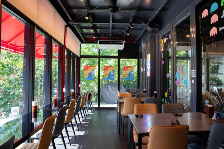 1階はお店のテーマカラーである赤と建物のグレー、周囲の緑が混じり合い、アジアを思わせる鮮やかな空間です。