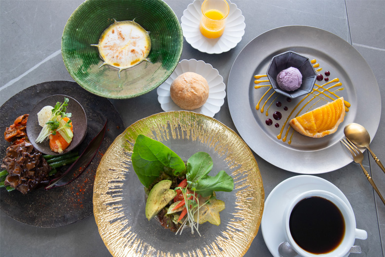 沖縄の旬の食材とフレンチを掛け合わせた料理が、色とりどりの器に盛り付けられた贅沢なコース料理です。