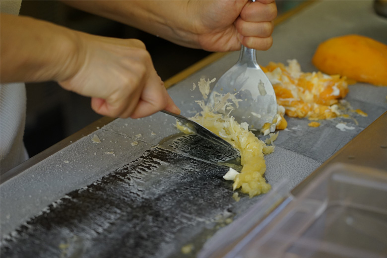 マイナス20度に冷やされた大理石の上で、自家製のシャーベットとソフトクリームとフルーツなどを瞬時にミックス。
