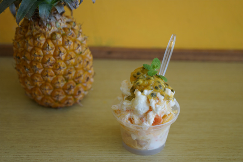 「石垣島のフルーツミックス」はパッションフルーツシャーベットとパイナップル、パパイヤ、ソフトクリームをミックス。