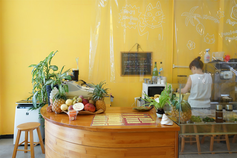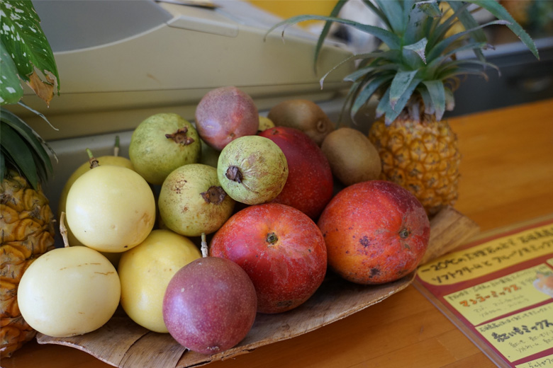 マンゴー、パッションフルーツ、島バナナ、ドラゴンフルーツ、パパイヤ、シークヮーサー、ライチなど、つかうフルーツのほとんどが自家栽培。