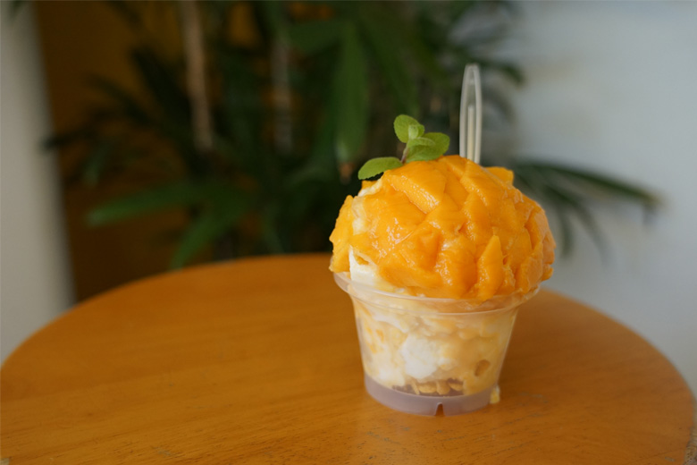 マンゴーシャーベットとソフトクリームがミックスされたアイスの上に、完熟のアップルマンゴーがどどんと贅沢にのっていて、甘くてみずみずしいマンゴーを堪能できます。