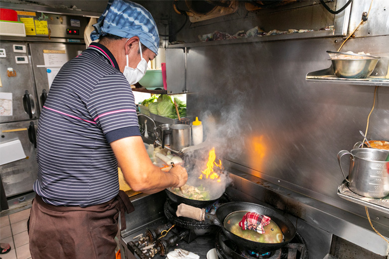 店主の儀部さんが熟練の手さばきでおいしい料理を次々につくり上げます。