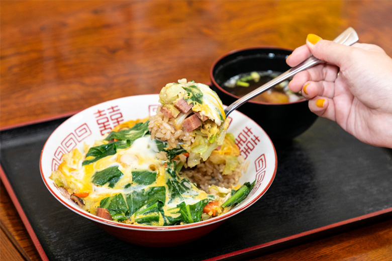 汁ものの長崎ちゃんぽんと違って、 ご飯の上に卵でとじた野菜炒めがのっている、沖縄風のどんぶりです。