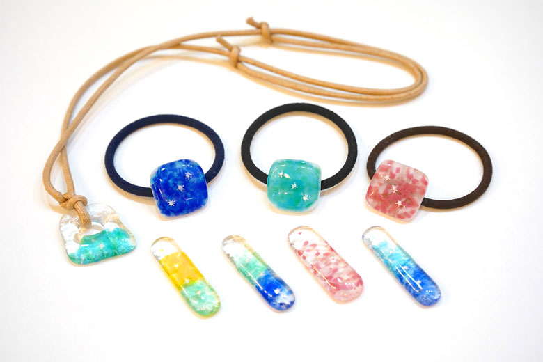 ネックレスや髪ゴム、はし置きなどには、西表島の星砂が散りばめられている可憐なデザインです。