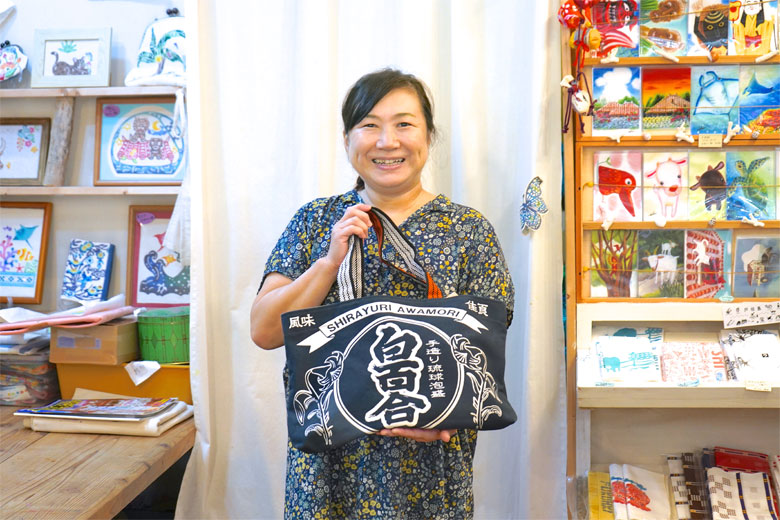 石垣島の池原酒造から許可を得て、前掛け生地から作られるバッグは、「ひらりよ商店」オリジナル商品です。