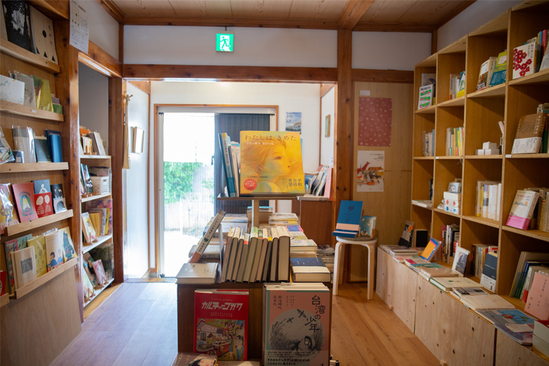 白瓦屋根の古民家に大きくかかった暖簾、そよぐ浜比嘉の風を感じながらゆっくりと古民家に足を踏み入れると、さまざまなデザイン、色合い、形の本がそれぞれの存在感で並んでいます。