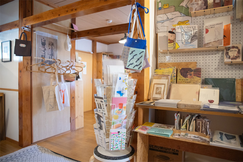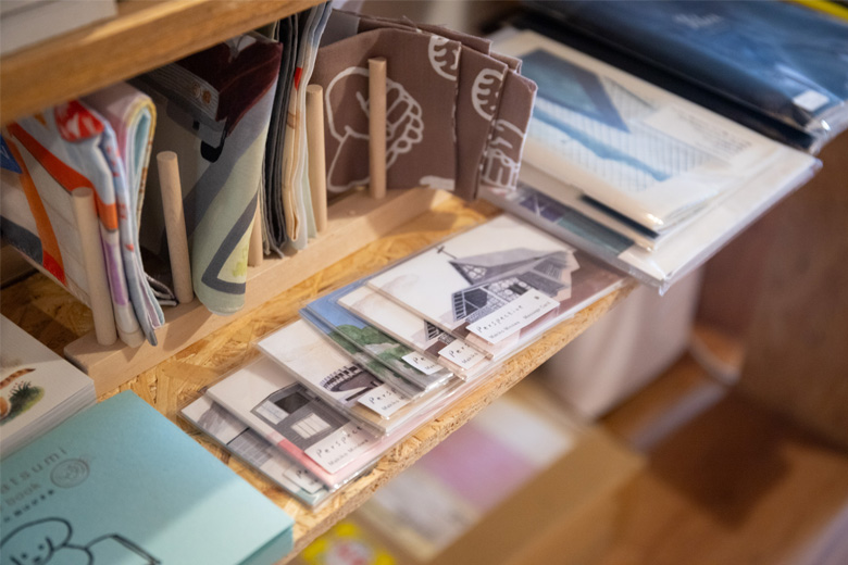 雑貨コーナーには、ここで企画展をした作家さんや、取り扱う本の表紙をデザインした作家さんによるてぬぐいやポストカード、本専用のポーチなど、どれも読書への好奇心をくすぐるものばかりが並びます。