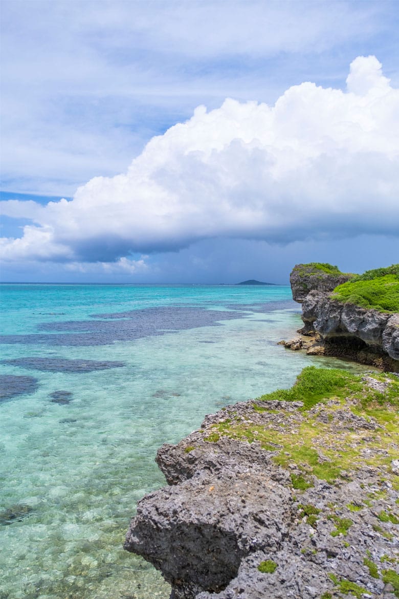 ビーチ横の岩場を歩いていくと神が住むといわれる島「大神島」が望めます。