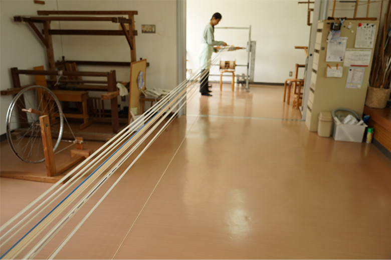 この日行われていたこの過程は、整経という、経(たて)糸をそろえていく作業。
