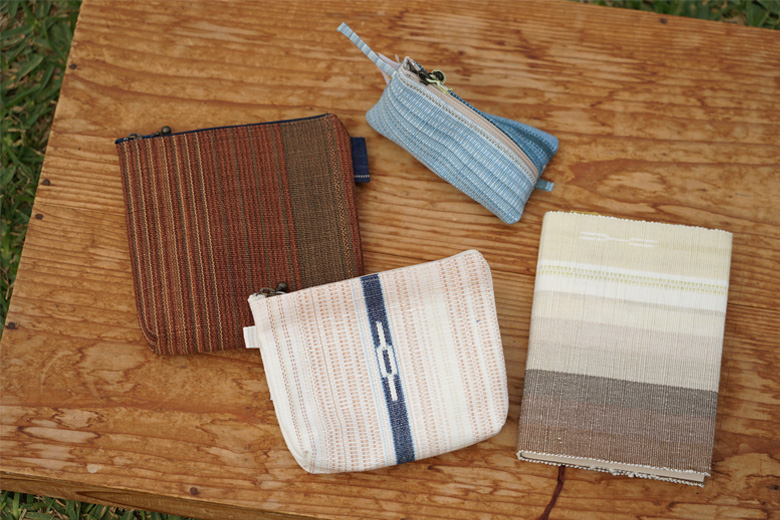 販売している、ポーチ、コースター、ブックカバー、小銭ケースなどの小物は、反物を仕上げた後に残ったものを活用して作られています。