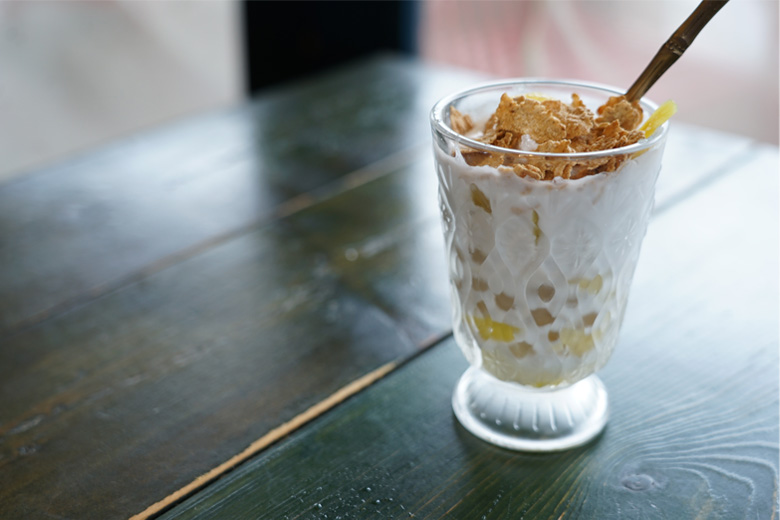 歯応えがあるジャックフルールと、もちもちのタピオカ、トッピングのコーンフレークと、様々な食感もおいしいんです。