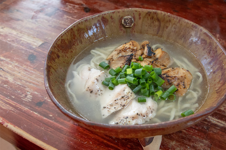 出汁は「鰹節」と「豚骨」の両方を使って作るのが一般的ですが、今回ご紹介する『いしぐふー鶏そば屋 港川店』で味わうことのできる「特選鶏そば」は、沖縄で唯一のやんばる地鶏で出汁をとった沖縄そばです。