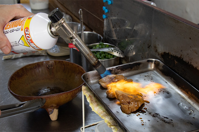 醤油ベースの甘辛ダレで味付けし、提供直前にバーナーで炙ったあぶり鶏は、香ばしい香りが鼻を抜け、さらに食欲をそそります。