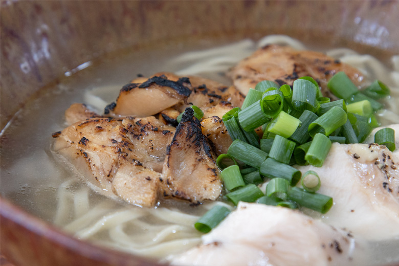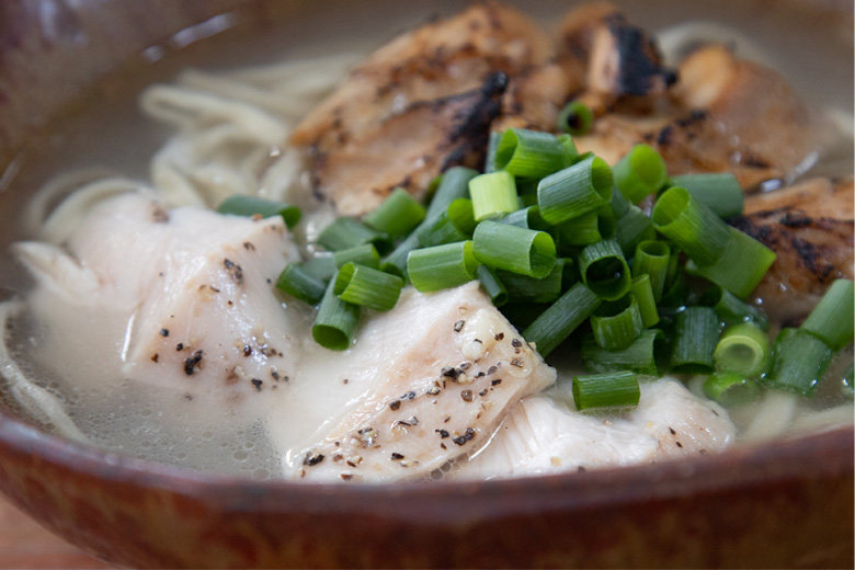 人気No.1メニューの「特選鶏そば」は、鶏もも肉を使った「あぶり鶏」と、鶏むね肉を低温調理した「しお鶏」2種類のトッピングがたっぷり入って、贅沢な仕上がりに。