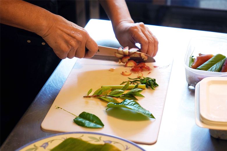ハーブは、レモングラスにミント、ホーリーバジル、ウコンの葉、コブミカンの葉など、7種類ほど、それから自家製の、サンバルという東南アジアご飯には欠かせないチリソース、そしてシークヮーサーが添えてあります。