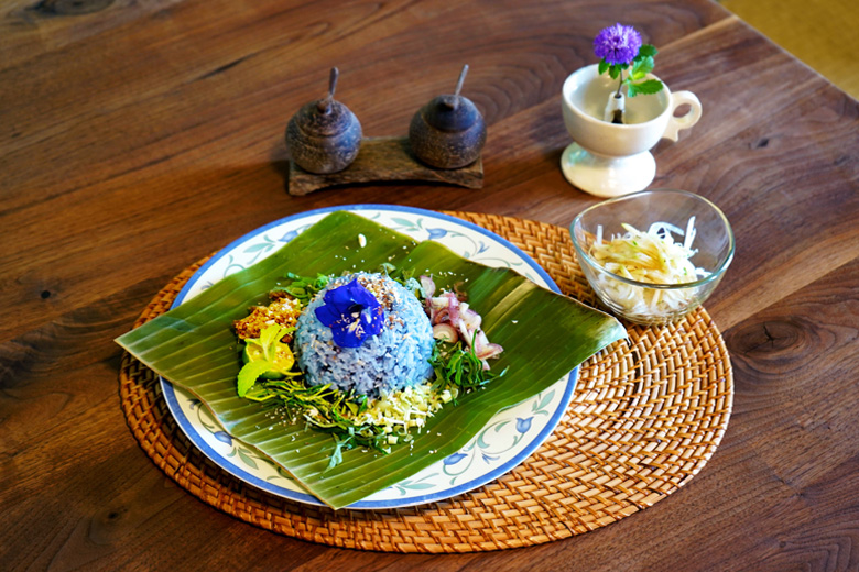 フレッシュなハーブがたっぷり盛り付けられたプレートは、「ナシ・ウラム」というマレーシアのハーブライス。