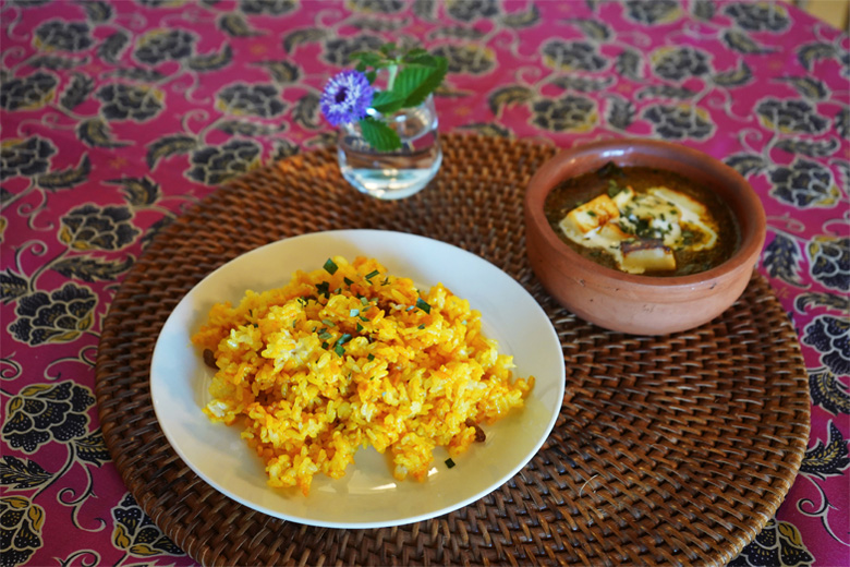 「サグ・パニール」は本場ではほうれん草とチーズのカレーですが、Joo Chiat Cafeでは、庭の空芯菜と揚げカッテージチーズのクリームカレー。