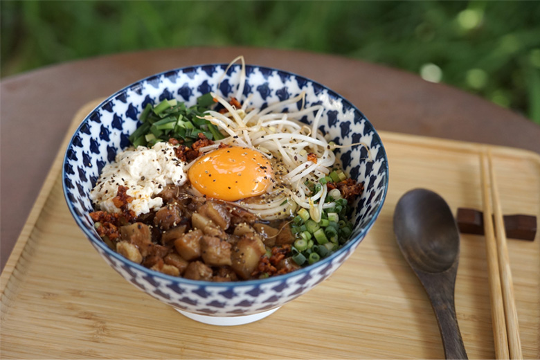 台湾料理の魯肉飯(ルーローファン)をアレンジ、たくさんの島素材をつかって誕生した「ルーローまぜそば」。