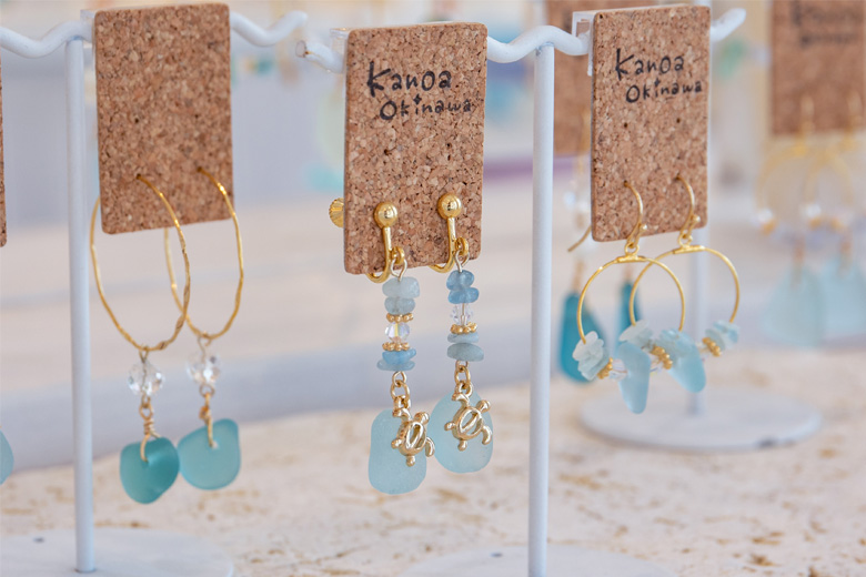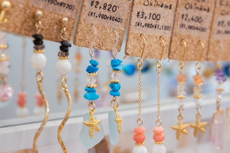 ホタルガラスリング、さざれ石ブレスレット、マリンチャームネックレス、淡水パールピアス、シーグラスピアス・イヤリング、シーグラスブレスレットなど品揃えが豊富で、つい目移りしてしまいます。