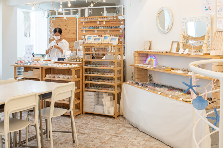 3階では「シェルフォトフレーム作り」「チェーンブレスレット作り」「さざれ石ブレスレット作り」「ネックレス作り」「ピアス・イヤリング作り」「天然石ブレスレット作り」の手作り体験ができます。