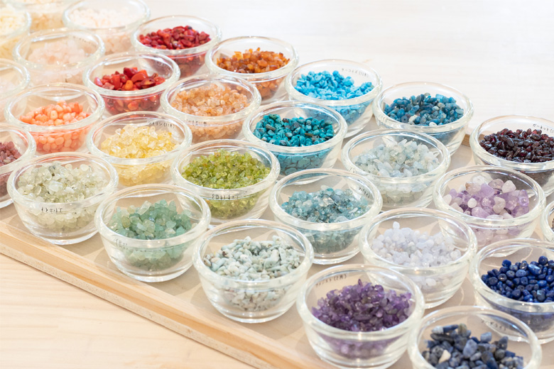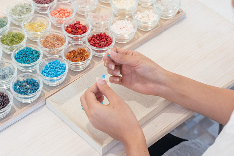 所要時間は20~40分ほどで、ラピスラズリやガーネット、ターコイズ、水晶、サンゴ、ローズクォーツなど36種類の天然石の中から好きな素材を組み合わせ、お好みでチャーム(有料)をプラスして仕上げていきます。