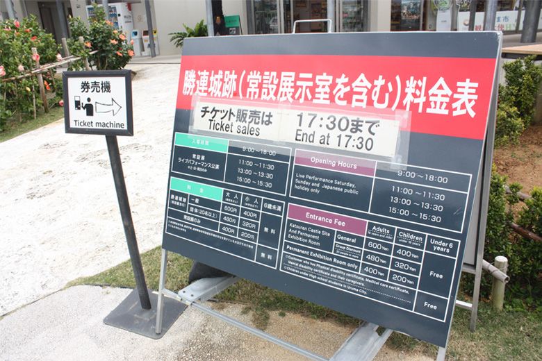 勝連城跡の入場料金は、一般 大人600円(高校生以上)、小人400円(中学生以下)、6歳未満無料。