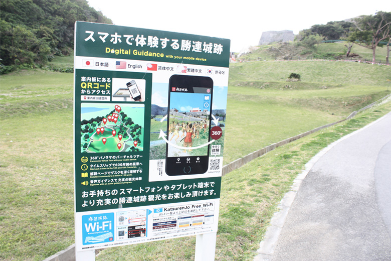 勝連城跡観光のすごいところは、手持ちのスマホやタブレットを使って、多言語で観光案内をしてくれるところ。