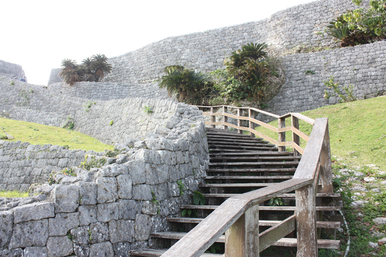 勝連城の階段を登っていると気づくのが、ゆるやかな右カーブの石階段。