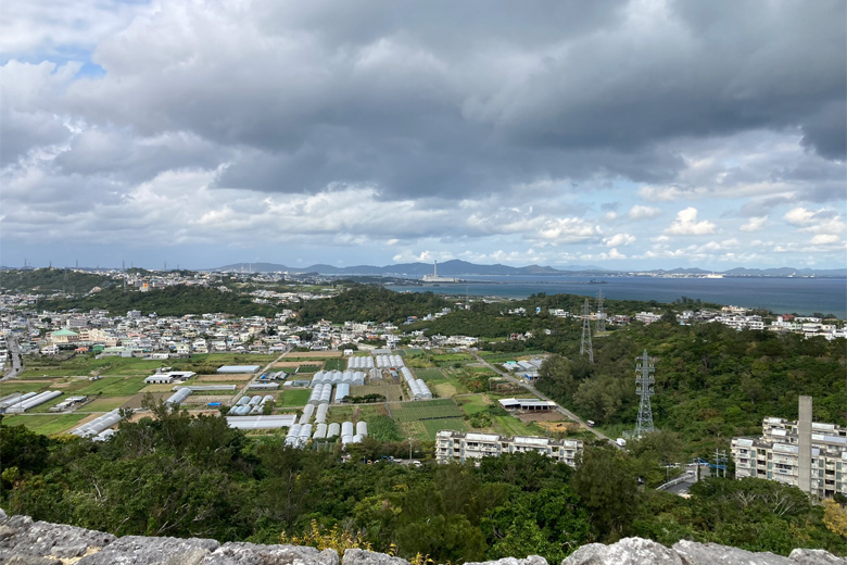 後方には勝連城跡が垣間見え、意気揚々とした気分になります。