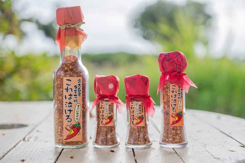 こちらは宮古島産の島とうがらしを荒めにひいた一味。