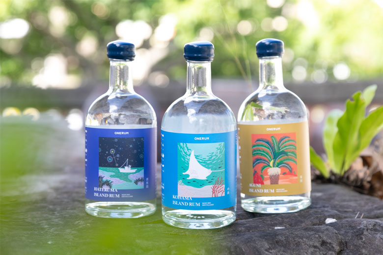 左から波照間島、小浜島、粟国島のラム。南十字星やマンタ、ソテツなど島のモチーフが目を引く