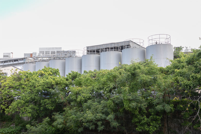 本社裏手にある大きな貯蔵タンク。写真左上にはモノレールの駅舎が見えます。