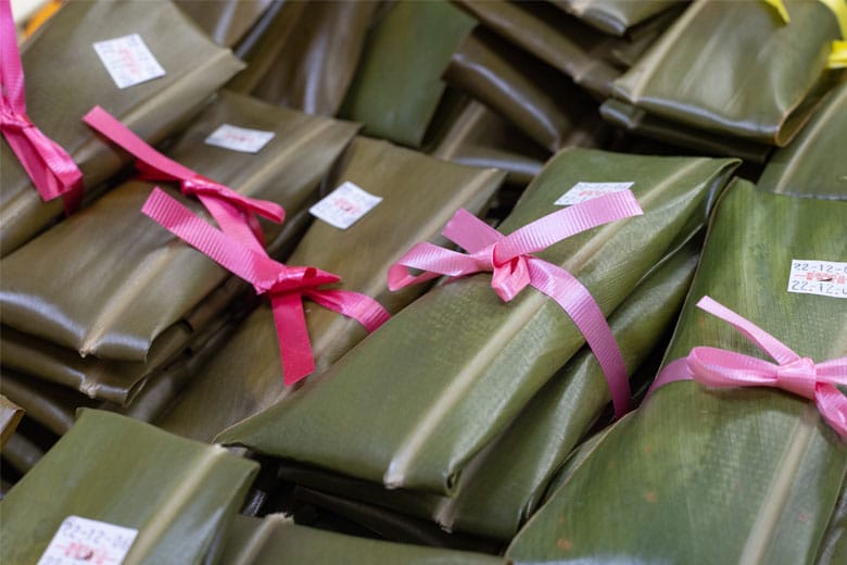 抗菌作用に優れ、リラックス効果も期待できる(アロマオイルにも使われるほど)植物、月桃(げっとう)の葉に包まれているカーサ・ムーチーは、沖縄では無病息災を願い、毎年旧暦の12月8日(2022年は12月30日)に食べられています。