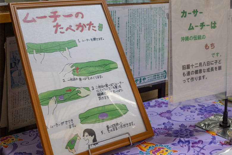 昔から地元の人たちに親しまれてきた「もちの店 やまや」には、旧暦の8月15日(十五夜)にお供えする「ふちゃぎ」や、お正月に食べられる「ナントゥー」など、沖縄行事には欠かせないお餅が並んでいます。