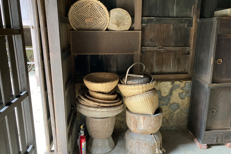 台所の端には、料理で使っていたカゴなどが置かれています。