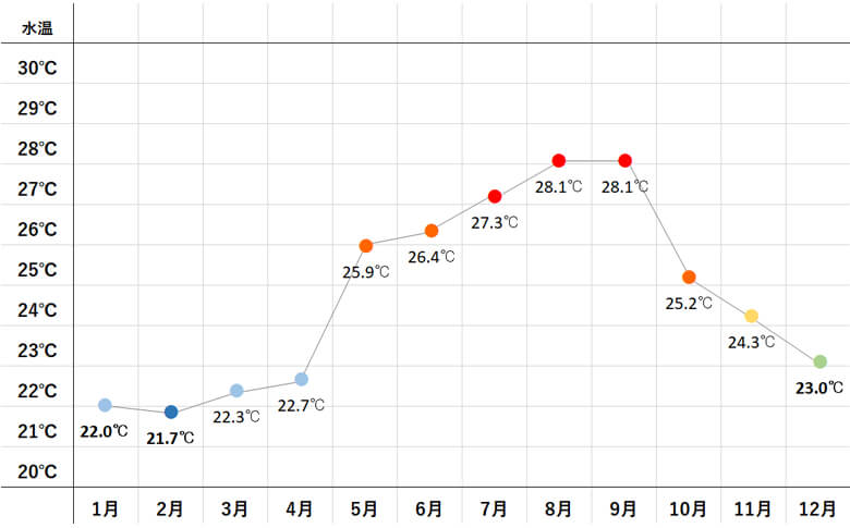 同じく海水温も年間を通して高めで、1月の海水温がだいたい22度ぐらい、一番冷たくなる2月でも21.5度ぐらいあって、保温効果のあるウェットスーツを着用して行うダイビングなら、問題なく水に入る事が出来るんですね。