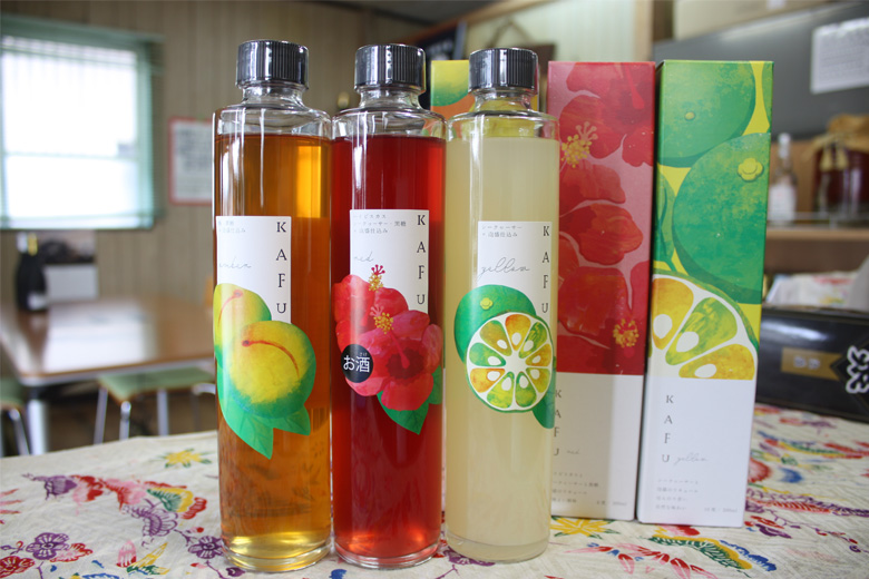 「ハイビスカス酒」は、ハイビスカスの花びらにシークヮーサー、レモン、アセロラを入れ、隠し味に県産の黒糖を。